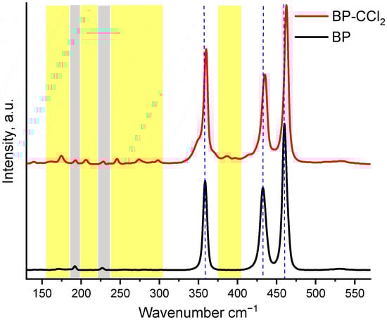 The Raman spectrum of bulk BP (Figure 3) shows characteristic peaks at 358.6, 432.6, and 460.2 cm−1, which correspond to one out-of-plane phonon mode, A1g, and two in-plane phonon modes, B2g and A2g, of the crystalline BP. It is worth noticing the appearance of signals at 192.7 and 227.3 cm−1, which correspond to edge phonons B1g and B13g in the crystal lattice of the BP [28]. These signals also appear in the Raman spectrum of the functionalized BP–CCl2 material, which indicates the retention of the overall crystallinity of the material. A slight shift of the A1g, B2g, and A2g phonon modes to the blue region (359.9, 435.3, and 462.5 cm−1, respectively) indicates the ultrathin nature of the 2D material [29]. In addition, the formation of new peaks in the regions of 175, 206, 245, 273, and 298 cm−1, as well as the formation of signals between A1g and B2g phonons in the region of 385–397 cm−1, are also observed. The appearance of these signals, as well as the broadening of the A1g signal, in the BP–CCl2 sample may indicate a distortion of the BP surface caused by the addition of a functionalizing agent. Thus, the formation of new signals in the Raman spectra in regions less than 400 cm−1 with especially pronounced signals in the regions of 250–300 cm−1 was reported for BPNS functionalized with methyl and hexyl groups [20,30]. Similar results were obtained by Sofer et al., in which the appearance of signals in the region of 230 cm−1 is associated with the formation of a P–C bond in BPNS functionalized with S-(bromomethyl) ethanethioate [19].