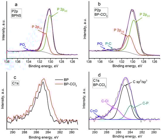 Comparison of the high-resolution C 1s core-level XPS spectra of BPNS and BP–CCl2 (Figure 5c) showed a significant broadening of the signal in the case of the functionalized material, which indicates the presence of carbon-containing fragments of different compositions, apart from the substrate material. Thus, in addition to C sp2/sp3 at 284.8 eV, the C 1s spectrum of BP–CCl2 could be deconvoluted into components with binding energies of 284.0, 286.7, and 289.3 eV, corresponding to the C–P, C–Cl, and C=O bonds, respectively [42], which confirms the covalent functionalization of BPNS with CCl2 fragments.