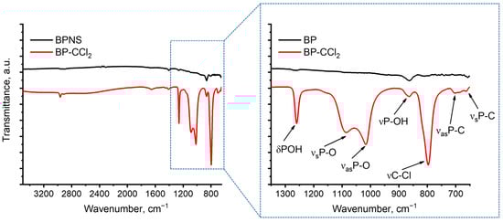 Fourier-transform infrared spectroscopy (FT-IR) was further used to characterize the BPNS and BP–CCl2 samples (Figure 6). The FT-IR spectrum of BPNS does not contain clearly defined peaks, apart from the low-intensity signals related to angle and stretching vibrations of P–OH groups at 1262 and 864 cm−1, respectively [43], which are observed upon the partial oxidation of the material’s surface. The BP–CCl2 sample also exhibits peaks of P–OH groups at 1255 and 864 cm−1, as well as the doublet at 1020–1080 cm−1 assigned to stretching vibrations of P–O groups [43]. Notably, the spectrum also contains signals at 797, 701, and 662 cm−1 belonging to vibrations of the C–Cl bond [44] and the asymmetric and symmetric vibrations of the P–C bond, respectively [45]. These facts additionally suggest the covalent functionalization of BPNS with dichlorocarbenes with the P–C bond formation.