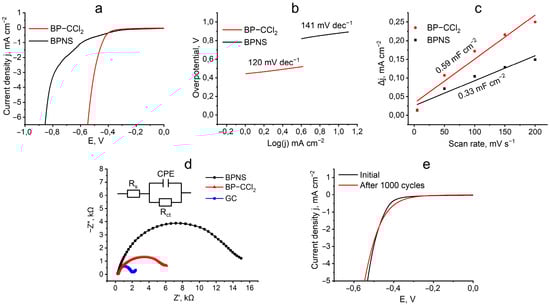 Next, using the electrochemical double-layer capacitance values (Cdl) found by recording the CV curves at different scan rates, we estimated the electrochemical active surface area (ECSA) of the modified electrodes. Figure 7c shows the dependence of the current density: Δj = janode − jcathode, on the potential scan rate recorded at a potential of 50 mV (vs. RHE) for BPNS and BP–CCl2 catalysts. The obtained data revealed that the functionalization of the material surface significantly increases the Cdl values from 0.33 mF cm−2 for BPNS to 0.59 mF cm−2 for BP–CCl2. The corresponding ECSA is determined to be 0.69 and 0.39 cm2 for BP–CCl2 and BPNS, respectively, indicating the 1.77 times increased ECSA value in BP–CCl2 compared to the pristine BPNS. Thus, the BP–CCl2 catalyst exhibits more abundant catalytically active sites, which significantly increase its activity in HER [41].