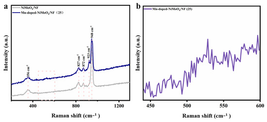 To gain insights into the structural composition of the material, the electrocatalyst was further characterized by Raman spectroscopy. As shown in Figure 3a, the Mn-doped-NiMoO4/NF possessed characteristic peaks attributed to NiMoO4 at positions 356 cm−2, 827 cm−2, 872 cm−2, and 948 cm−2 [41]. The band at 923 cm−1 and 872 cm−1 indicates the symmetric stretching and asymmetric stretching bonds of the Mo–O bonds, respectively. Another band at 356 cm−1 was assigned to the bending vibration of the O–Mo–O units [42,43]. In contrast to NiMoO4/NF, the broad Raman band located in the range of 440 cm−2 to 600 cm−2 may be attributed to the Mn–O bonding vibrational mode of the oxides of amorphous Mn (Figure 3b). The above conclusions are consistent with the XRD results.