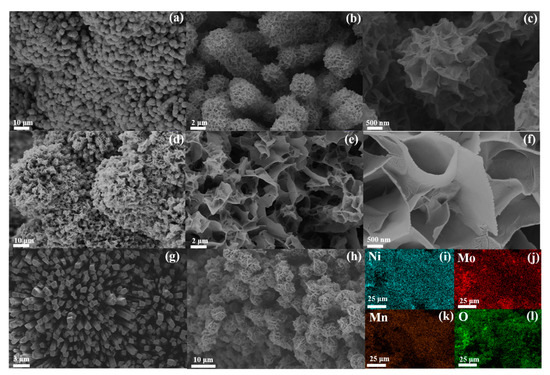 SEM images of (a–c) the Mn-doped-NiMoO4/NF (0), (d–f,h) the Mn-doped-NiMoO4/NF (25), (g) NiMoO4/NF/(i–l) EDS mapping images of the Mn-doped-NiMoO4/NF (25).
