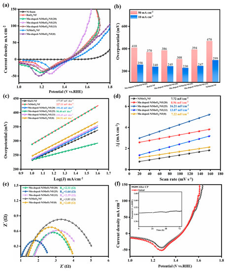 In summary, we successfully prepared self-supported electrodes (Mn-doped-NiMoO4/NF (25)) on 3D conductive nickel foam with a rod-like nanosheet array structure by a two-step hydrothermal and low-temperature calcination method. The electrocatalytic performance tests demonstrates that the doping of Mn elements could effectively modulate the NiMoO4/NF morphology, and the electronic valence state of its surface improved the electrical conductivity as well as provided more active sites. In addition, the tight connection between NiMoO4 and Ni foam effectively prevented agglomeration between the electrocatalysts, giving the catalyst excellent stability. In particular, the Mn-doped-NiMoO4/NF (25) only required 230 mV to drive a current density of 10 mA cm−2, and stable tests were completed for at least 76 h under alkaline conditions. During this process, the oxidation state of Ni increased and there was more Ni3+ as well as the rapid dissolution of MoO42−, thus showing excellent OER activity. The designed electrocatalyst has the advantages of high activity and stability, and show the potential to be applied to the OER on a large scale. This work provides a new idea for the design and development of non-precious metal catalysts with a transition metal element doping strategy.