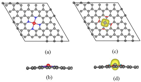 We first investigated the optimized structure of Re@NDV, as displayed in Figure 1a,b. The optimized stable structure of Re@NDV involved the Re atom located on the top site of NDV. The distance between Re and NDV was 0.303 Å, which is much lower than that of Re@Gr (1.686 Å). To examine the stability of the Re atom at the nitrogenized divacancy, we estimated the binding energy, which is expressed as: