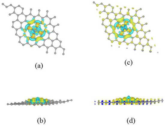 Charge density difference isosurfaces of Re@NDV under neutral and adding 0.2e/unit cell, respectively. (a,c) Top view; (b,d) side view. The yellow color represents charge accumulation, while the cyan color represents the charge depletion zone. .