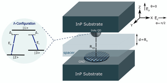We examined the light–matter interaction utilising a semiclassical model, where we considered a nanoplasmonic hybrid system consisting of GNDs and QDs embedded in a dielectric medium of indium phosphide (InP), as illustrated in Figure 1. The monolayer GNDs can provide strong confinement of the electromagnetic field beyond the diffraction limit as localised surface plasmons (LSPs) and offer remarkable properties due to the very high mobility of its charge carriers [19,27,28]. On the other hand, the gain medium is a self-assembled semiconductor quantum dot modelled as a three-level atomic system of configuration, as shown in Figure 1.