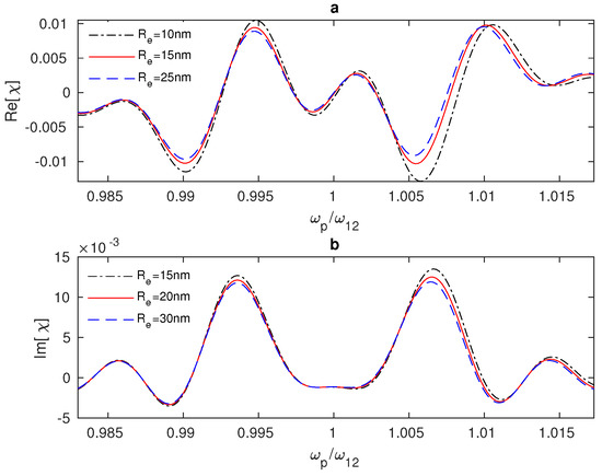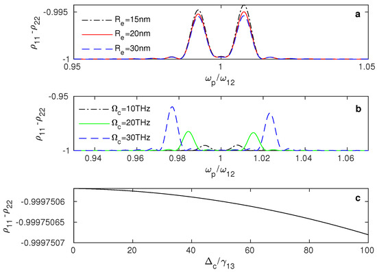 where the index indicates the external fields, p refers to the probe field (polarised in z-direction), c refers to the control field (polarised in x-direction), and is the Rabi frequency of the external fields, where . indicates the atomic coherence [23], and the index refers to the atomic states in the QD, and , which are coupled to the upper excited state through . is the effective dielectric constant [19,23], is the dielectric constant of the background dielectric medium, and is the dielectric constant of the QD. The system’s parameters and are written as follows: