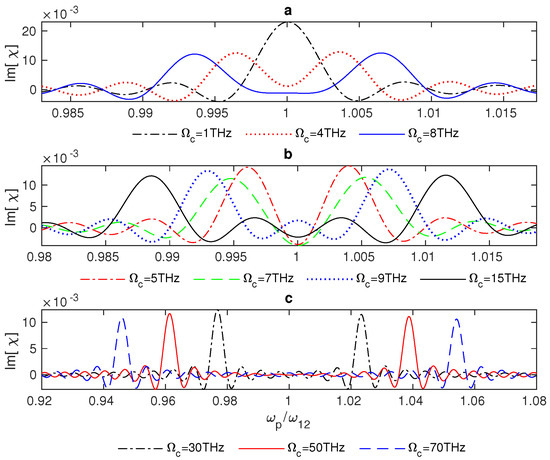 Generally, in three-level atomic systems, the linear optical response can be modified due to the interaction with a strong resonant field that is able to dress the atomic states, preventing the absorption of another weak resonant field between two paths of absorption, which result from the formation of two dressed states rather than one excited state [44,45]. Furthermore, it is evident that for small Rabi frequencies of the control field , the susceptibility will be reduced to that of two-level systems, which appears in the absorption spectrum as a single peak of absorption at the resonance (), as seen in Figure 4a—the dot-dashed line. Moreover, applying a stronger control field to the hybrid system will cause two peaks of absorption to emerge gradually until an EIT window appears at (Figure 4a, the solid line). Interestingly, there is a switch between negative and positive absorption in the vicinity of resonance at Rabi frequencies between 9 THz and roughly 29 THz, where the range of switching increases as the Rabi frequency of the control field increases (Figure 4b). Furthermore, negative absorption arises precisely at resonance, just ahead of the emergence of the EIT window at Rabi frequencies ( = 5–7 THz) (Figure 4b).