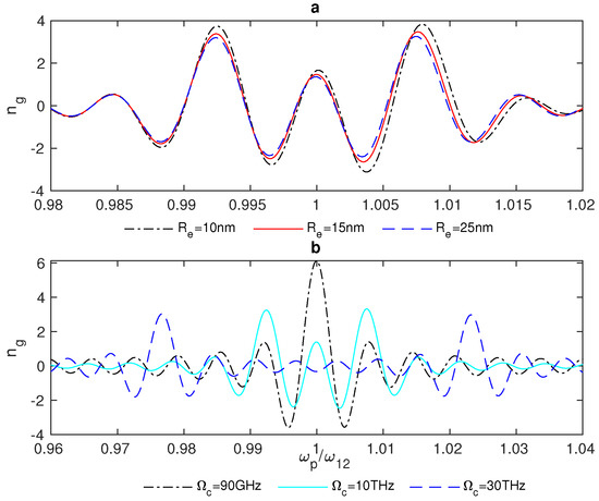 In Figure 7, we notice that there is switching between , which indicates slow light and subluminal propagation through the system, and , which results in superluminal propagation via the system and fast light. In addition, the group index switching between fast and slow light is enhanced for small distances between the system’s components (Figure 7a). Further, the interaction of the system with a stronger control field provides a wider range of frequencies around the resonance for the switching between fast and slow light, as illustrated in (Figure 7b).