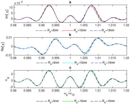 In addition, we examined the group index in the plasmonic hybrid system in a narrow range of frequencies around the resonance (). Figure 7 shows the group index of the weak probe field propagating in the vicinity of the resonance of the QD impacted by the plasmonic effects of the GND.