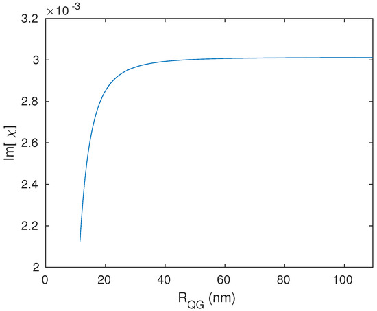Interestingly, we found that the centre-to-centre distance between the system’s components must be in the direction of the polarised probe field, which was chosen to be along the direction of the excitation energy of the graphene surface plasmons (z-direction), which matches the excitation energy of the QD. Otherwise, the response of the plasmonic hybrid system to changing the distance will deviate from what is known according to the DDI. The strength of this interaction should decrease significantly when the distance increases. Indeed, when the distance is perpendicular to the hybrid system’s resonance energy direction (the probe field’s direction) (Figure 8), we note that the hybrid system responds to adjusting the distance in an opposite manner to what is expected. The optical properties exhibit higher values for larger distances between the system’s components (Figure 9) for a concise range of values before the hybrid system losses its sensitivity toward (Figure 10). The reason behind this odd optical response of the hybrid system is that the interaction is in the direction of the polarised robust control field and not along the resonance direction of the hybrid system. Compared with the above results obtained by the setup shown in Figure 1, for the plasmonic hybrid system to respond to changing of the geometrical parameter , the distance between the system’s components must be in the direction of the hybrid system’s resonance energy, which means the angle must be zero, and must be (as can be seen in Figure 1). Furthermore, if we return to the Equation (15), we can see that the numerator contains the factor . will be negative when the distance and the polarised probe field are perpendicular (). The odd direct relationship between the distance and the response of the optical properties of the hybrid system is explained by the negative sign of with in the denominator. Moreover, the terms () and () are included in the denominator of the equation of the system’s susceptibility (Equation (15)), and the factors and inversely depend on and , respectively; hence, plays a significant role in all the optical properties of the system, and choosing in the direction of the system’s resonance energy is critical in the GND-QD hybrid system.