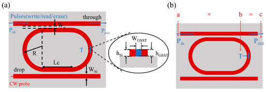 Figure 1a shows the 1 × 2 GSST-slot racetrack resonator structure on the silicon-on-insulator (SOI) platform, which consists of two strip waveguides, a racetrack resonator, and GSST filled in the slot. When the GSST is in the crystalline state, the coupling between the input waveguide and the resonator does not meet the phase-matching condition due to the high absorption of the GSST, and the light is directly output from the through port. When the GSST is in the amorphous state, the phase-matching condition is satisfied, and the light is coupled into the resonator at the resonant wavelength. By controlling the crystallization degree of the GSST, multi-level tuning of the device transmission can be achieved. A bidirectional pump–probe scheme was employed for GSST amorphization by write pulse (Pwrite) and the crystallization by erase pulse (Perase). The state of the GSST is read out by the optical transmission through a read pulse (Pin). To avoid the influence of Pin on the state of the GSST, it is necessary to satisfy EPin < E0 < EPwrite, where EPwrite and EPin are the respective energies of the write pulse (Pwrite) and the read pulse (Pin). E0 is the threshold energy for the crystalline GSST to begin amorphization.