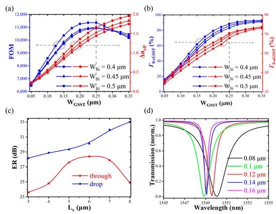 The relevant parameters of the device selected are as follows: a resonator radius of R = 5 μm, GSST height of hGSST = 0.22 μm, and silicon waveguide height of hSi = 0.22 μm. The optical quality factor FOM = is introduced to determine the width of the slot [16], where ∆neff represents the difference in the real part of the effective refractive index of the hybrid GSST-Si slot waveguide between the crystalline (cGSST) and amorphous (aGSST) state, and ka-neff is the imaginary part of the effective refractive index in the amorphous state. To support the fundamental mode propagation the conventional waveguide widths of 0.4 μm, 0.45 μm, and 0.5 μm are selected. The GSST width WGSST varies from 0.05 μm to 0.35 μm. As shown in Figure 2a, ∆neff increases with the GSST-slot width. This is because the neff of cGSST greatly varies, while the neff of aGSST has a small change due to the relatively small difference in refractive index between aGSST and silicon. Therefore, when GSST is in an amorphous state, the optical mode of the hybrid waveguide is very similar to that of the silicon waveguide. In contrast, there is a big difference in the crystalline state [16]. FOM reaches the maximum when WGSST = 0.25 μm due to the strong interaction between PCM and light.