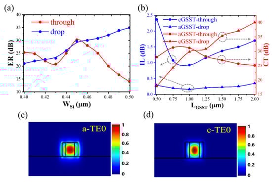 The GSST length (LGSST) was further optimized by monitoring the IL and crosstalk (CT). IL means how much light is transmitted through the corresponding active port and CT represents the partial light through the inactive port. When GSST is in the amorphous state, light is mainly output from the drop port. As LGSST increases (see Figure 3b), the IL of the drop port first decreases and then increases.In the case of LGSST = 1μm, the input waveguide and the resonator meet the phase-matching. The light at the drop port reaches a maximum, indicating the minimum of the IL and the maximum of the CT. The minimum IL of the drop port is about 0.16 dB, and the CT of the through port achieves 31.15 dB. When GSST is in the crystalline state, insufficient LGSST leads to partial light leaking to the drop port, and excessive LGSST will increase the absorption of the material (high absorption in the crystalline state). In the case of LGSST = 1 μm, the IL of the through port is at a minimum value of 0.93 dB, and the CT of the drop port is larger (~29.8 dB). The ILs of both crystalline and amorphous states are smaller than the devices based on the PCM-on-top microring resonator previously reported [13]. Therefore, LGSST is optimized to be 1μm. The IL of the through port is larger than that of the drop port. This is because the coupling length is long enough to enable more optical signals to be coupled into the racetrack resonator. In addition, the slot structure increases light absorption due to the enhanced light–matter interaction. Figure 3c,d show the TE0 mode distributions of GSST in the amorphous and crystalline states, respectively, where WSi = 0.45 μm, WGSST = 0.25 μm, and hGSST = 0.22 μm. When GSST is crystalline, the optical field is mainly confined in the slot due to the high refractive index of GSST.