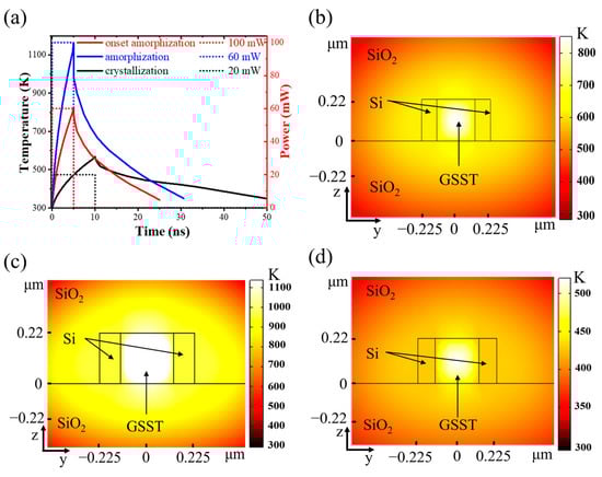 (a) Temperature response of GSST and input optical pulse; 2D cross-sectional temperature distribution at the slot for GSST (b) onset amorphization, (c) complete amorphization, and (d) crystallization.
