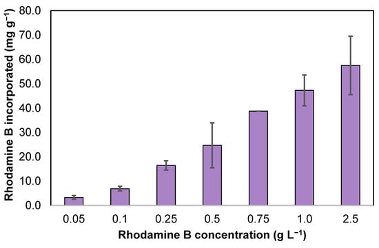 ZIF-8 was prepared in aqueous solutions containing different concentrations of rhodamine B, and a method to monitor the amount of rhodamine B encapsulated in the obtained crystals was developed. The aim of this preliminary screening is to obtain the ZIF-8 with the highest rhodamine B uptake. In order to be able to quantify the amount of rhodamine B in the ZIF-8 crystals, a calibration curve of rhodamine B in water was carried out using UV-vis spectrophotometry in the range of 1–5 mg L−1 of rhodamine B (y = 0.1848x − 0.0027; R2, 0.9996). Rhodamine B was added to the 2-methylimidazole aqueous solutions to a resulting concentration of 0.05, 0.1, 0.25, 0.5, 0.75, 1.0, 2.5 g L−1. To examine the amount of rhodamine B encapsulated within each of the synthesized solids, an experiment was undertaken wherein 5 mg of each solid sample was placed in a solution of EDTA (0.1 mol L−1, 5 mL). The resulting solutions were placed in an orbital shaker until the solids have completely dissolved. EDTA was employed for dissolution of the resulting Zn(II)/2-methylimidazole-based solids as the EDTA binds to the zinc as a chelating ligand and replaces the 2-methylimidazole, forming a water-soluble Zn-EDTA complex. The absorbance of the released rhodamine B was then measured using UV-vis spectrophotometry. Figure 2 shows a clear trend regarding an increasing amount of rhodamine B incorporated into the obtained precipitates based on Zn(II) and 2-methylimidazole, while increasing the concentration of rhodamine B in the synthesis step up to a concentration of 2.5 g L−1.