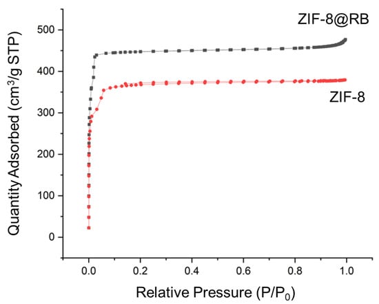 Nitrogen adsorption/desorption porosimetry was employed to characterise both ZIF-8 and ZIF-8 rhodamine B materials and to observe any porosity changes presented by the encapsulation of rhodamine B. The prepared ZIF-8 crystals had a surface area of 1392 m2 g−1 and a type I isotherm with a steep nitrogen uptake increase at P/P0 < 0.1, typical of microporous materials (Figure 5). The obtained surface area for ZIF-8 falls in the expected range normally reached when this material is prepared in aqueous medium and at room temperature. A significant increase in surface area was measured for the ZIF-8@RB with a surface area of 1790 m2 g−1 (Figure 5), in agreement with other preparations of ZIF-8@RB already reported in the literature [25]. ZIF-8@RB also presented a Type I isotherm but, in this case, a small increase in nitrogen uptake is also observed for P/P0 > 0.9, which is attributed to the potential formation of interparticle macropores due to the aggregation in the dry state of the smaller size of the ZIF-8@RB crystals.