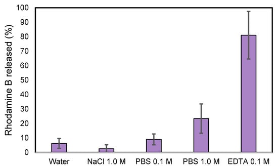 The stability of ZIF-8@RB in different media, such as salts and buffers, was evaluated. The methodology consisted of placing the ZIF-8@RB (10 mg) in 10 mL of each of the prepared media solutions (See Section 2.5) and leaving the solutions in an orbital shaker for 24 h. The percentage of rhodamine B released was measured after the 24 h and this experiment was repeated in triplicate. Figure 6 shows that ZIF-8@RB is unstable in 0.1 M EDTA due to the chelating effect of the EDTA binding the Zn(II) of ZIF-8. In all instances, a release of at least 65% of the rhodamine B amount present in ZIF-8 was observed, confirming the instability of ZIF-8 in this medium. Performing the same experiment in water, or in NaCl 1 mol L−1 solution, an average value <6% of the rhodamine B present in the ZIF-8 material was released after 24 h. This could be attributed to a residual release of rhodamine B because of the extended soaking times of the ZIF-8@RB crystals in these solutions, since no residual leaching was observed in the last washing steps after ZIF-8@RB preparation using water or methanol. While rhodamine B release was <10% when using PBS 0.1 M as the medium, a significant increase was observed using a more concentrated PBS buffer of 1.0 M, producing a 22% release of rhodamine B, confirming the limited stability of ZIF-8 depending on the concentration of PBS buffer used. These results confirmed the usability of rhodamine B release as a simple and fast approach to detect potential stability issues in the application of MOFs for environmental applications. However, to know exactly the details of the mechanism of this instability, full characterization of the crystalline material after extraction would be required.