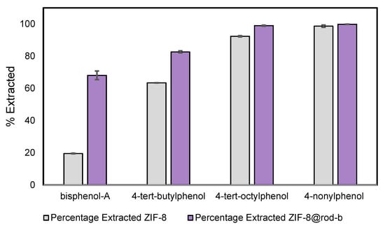 The performance of ZIF-8 and ZIF-8@RB for organic pollutant extraction was then compared. The organic pollutants selected for this study were phenols, specifically bisphenol-A, 4-tert-butylphenol, 4-tert-octylphenol, and 4-nonylphenol. These phenols were chosen due to their persistence in the environment in natural waterways and soil near waterways alongside their toxicity [37]. Thus, an experiment was undertaken wherein ZIF-8 (10 mg) or ZIF-8@RB (10 mg) were placed into 1 mg L−1 standard solution containing both bisphenol-A, 4-tert-butylphenol, 4-tert-octylphenol, and 4-nonylphenol. These solutions were placed in an orbital shaker for 24 h. The resulting mixtures were filtered by syringe filters (0.45 µm pore size) to filter the ZIF-8 and ZIF-8@RB crystals and the resulting filtrate was analyzed by HPLC-UV to quantify the remaining phenols in the solution and thus the amount extracted by the ZIFs.