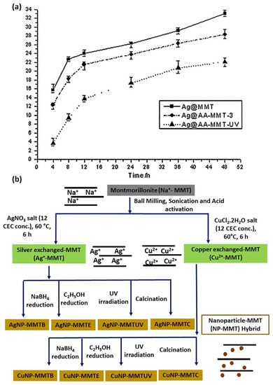 (a) Comparison of silver release properties of Ag@MMT, Ag@AA-MMT-3 and Ag@AA-MMT-UV. Adapted from [186] with permission from Elsevier (Copyright 2014). (b) Preparation protocol followed for synthesis of Ag/MMT and Cu/MMT nanohybrids. Adapted from [31], with permission from Elsevier (Copyright 2018).