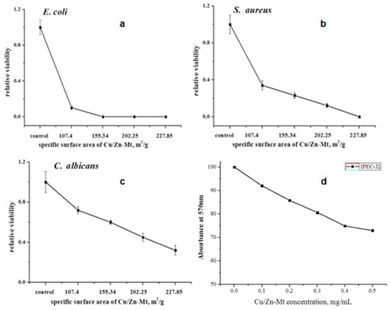 (a–c) The antimicrobial activity of Cu/Zn-MMT-2 with different specific surface area, (d) the cytotoxicity of Cu/Zn-MMT. Adapted from [229], BMC part of Springer Nature, distributed under the terms and conditions of the Creative Commons Attribution (CC BY) license.