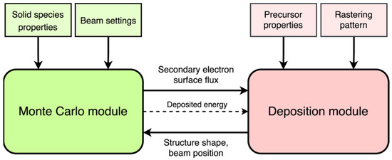 The fast FEBID simulation represents a direct-write material deposition simulation based on a chemical reaction (dissociation) driven by the electron irradiation. It consists of two major blocks working in turns: a Monte Carlo electron beam-matter module and a deposition process module (Figure 1). The simulation volume space discretization with equally sized grid cells is employed.