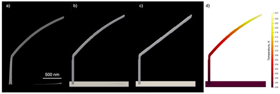 The effect of activating temperature tracking on the shape of the tilted segment is depicted in Figure 4. The characteristic down curvature observed in the experimental results is very well reproduced in the simulation and is a consequence of the temperature-dependent surface diffusion and residence time. The shown temperature profile corresponds to the moment when the simulation was completed. The simulation also reproduced the formation of the co-deposit on the substrate just below the tilted segment. By retrieving the beam position from the saved data and performing a static Monte Carlo simulation during the tilted segment growth stage, the co-deposit formation can be observed (see Figure 5). Figure 4a shows that the scattering of the beam in the tilted segment is strong enough to exclude localized co-deposit formation by transmitted electrons. All electron trajectories already exhibit significant scattering at a penetration depth of about 20 nm into the tilted segment. Localized co-deposit growth is a consequence of the decreasing lateral growth speed due to the rising temperature, which causes the beam spot to be ahead of the growth front and, thus, partially hit the substrate.