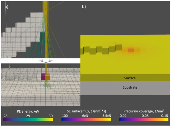 where nSE is the number of emitted secondary electrons, ε is the energy required for the emission of a secondary electron, ∆s is the length of a trajectory subsegment. The values of f and ε were taken from [6]. The secondary electrons are emitted in a random direction so that nSE can be regarded as an isotropic SE source. By randomly picking the direction of a vector equal in length to the inelastic mean free path λ [34], SEs are emitted from the source position and then tested for traversing a surface voxel. If a vector traverses a surface voxel, the number of emitted electrons is associated with that voxel. The subsegment length or segment discretization ∆s is chosen such that a sufficient number of vectors pierce the surface to describe the spherically random direction distribution. The procedure results in a spatially resolved surface secondary electron emission profile f that is used in the reaction–diffusion Equation (1). In order to avoid unnecessary computations, segments at depths z > 2·λ below the surface are not considered during this procedure. They are bookmarked for the later calculation of beam heating (Section 2.4).