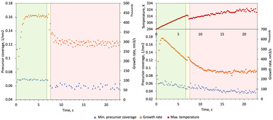 Change of precursor coverage and growth rate during two simulated growths of the same hockey stick. Data on the left was collected with temperature tracking disabled. Data on the right was obtained with temperature tracking enabled during the simulation. The precursor coverage value plotted refers to the respective smallest value on the whole surface and, ultimately, corresponds to the center of the BIR. The growth rate is calculated as the total volume deposited during a time step. The increasing scatter of the recorded temperatures is due to the decreasing number of heat source cells as the tip gets thinner, which is effectively amplified by the rising thermal resistance of the structure.