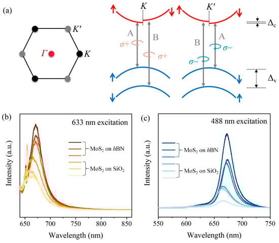 From the top view of the crystal structure in MoS2, a hexagonal honeycomb lattice structure can be observed that generates two sets of degenerate-but-not-equivalent valleys, K and K’, at the edges of the first Brillouin zone (left panel, Figure 3a). These valleys that are degenerate in energy exhibit a huge splitting in the valence band (Δv = ~148 meV) induced by spin-orbit coupling and a much smaller one in the conduction band (Δc = ~3 meV), which is also depicted for completeness (right panel, Figure 3a), for the MoS2 monolayer [29,30,31,32]. The K and K’ valleys are differentiated by the opposite spin orientations corresponding to the valence band maximum (VBM) and conduction band minimum (CBM). As schematically displayed in the right panel of Figure 3a, combined with the time reversal symmetry, the spin orientations of the K and K’ valleys are anti-symmetric, enabling a locking of the spin and the valley degree of freedom. The remarkable difference guarantees the valley-dependent optical selection rules that the direct excitonic transitions should obey, including A and B, in the MoS2 monolayer. To be specific, the circularly polarized lights with left-handed helicity (σ+) excite the excitonic transitions in the K valleys exclusively, whereas those lights with right-handed helicity (σ−) only couple to the K’ valleys. In our previous report [24], we reported that the A excitonic emission from the MoS2 monolayer on the hBN flake exhibited a ubiquitous enhancement compared with that on SiO2/Si. As plotted in Figure 3b,c, the intensities of the PL signals from MoS2 on hBN are much stronger than those obtained from MoS2 on SiO2, both under 633 nm and 488 nm excitation.