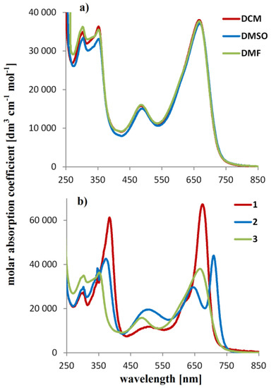 UV–VIS spectra of (a) Pz3 in dichloromethane (DCM), dimethylsulfoxide (DMSO), and N,N-dimethylformamide (DMF); (b) Pzs 1–3 in dichloromethane.