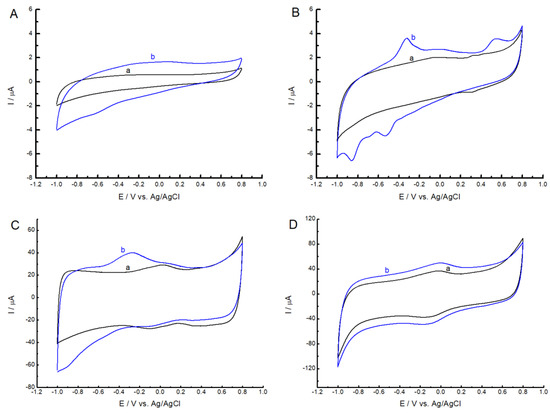 Cyclic voltammograms of hybrid materials recorded in phosphate buffer (pH 7.4). Scan rate 50 mV s−1. The black line (a) corresponds to the GC electrode without Pz3, and the blue line (b) to the GC electrode with Pz3, respectively for: (A) GC; (B) GC/MWCNTs; (C) GC/SWCNTs; and (D) GC/rGO.