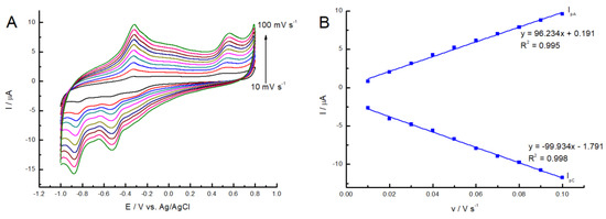 (A) Cyclic voltammograms of GC/MWCNTs/Pz3 modified electrodes in phosphate buffer (pH 7.4) at 10–100 mV s−1 scan rate. (B) Dependence of the scanning rate on the peak current Ip.