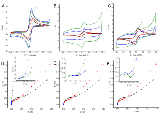 (A) Cyclic voltammograms of GC (a, black line), GC/Pz3 (b, red line), GC/MWCNTs (c, green line), GC/MWCNTs/Pz3 (d, blue line); (B) CVs of GC (a, black line), GC/Pz3 (b, red line), GC/SWCNTs (c, green line), GC/SWCNTs/Pz3 (d, blue line); (C) CVs of GC (a, black line), GC/Pz3 (b, red line), GC/rGO (c, green line), GC/rGO/Pz3 (d, blue line). All CVs were recorded in a phospahate buffer (pH 7.4) containing 1 mM [Fe(CN)6]3− at a scan rate of 10 mV s−1. (D–F) Nyquist diagrams of respectively modified electrodes in a phospahate buffer (pH 7.4) containing 1 mM [Fe(CN)6]3−/4−.