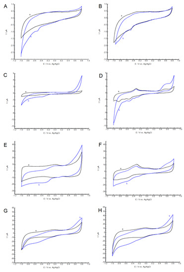 Cyclic voltammograms recorded for (A) bare GC, (B) GC/Pz3, (C) GC/MWCNTs, (D) GC/MWCNTs/Pz3, (E) GC/SWCNTs, (F) GC/SWCNTs/Pz3, (G) GC/rGO, and (H) GC/rGO/Pz3. Experiments were performed in a phosphate buffer (pH 7.4) before (a, black line) and after (b, blue line) adding 2 mM of hydrogen peroxide. A scan rate of 10 mV s−1 was used.