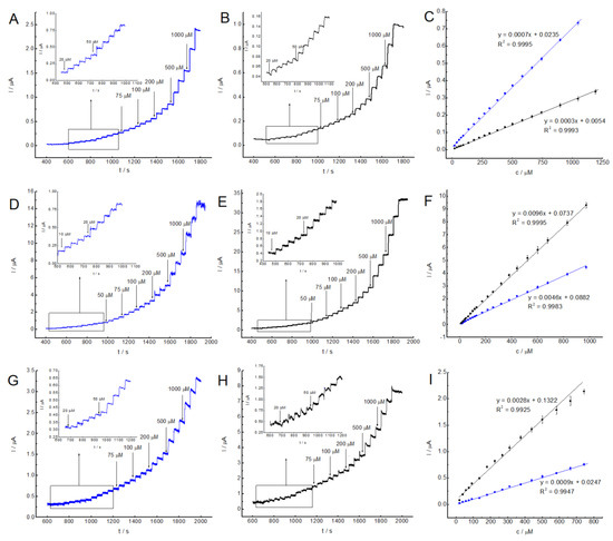 Furthermore, under stirring conditions, chronoamperometric measurements were made for GC/MWCNTs/Pz3, GC/SWCNTs/Pz3, and GC/rGO/Pz3. The oxidation of H2O2 at the electrodes was driven by the applied anodic potential of +0.6 V. Figure 6A shows the increase of the amperometric signal after the addition of small amounts of H2O2. The GC/MWCNTs/Pz3 electrode expressed linearity within 20–1200 µM of H2O2. For GC/SWCNTs/Pz3, linearity was seen in the H2O2 concentration range of 10 to 980 µM. For the GC/rGO/Pz3 electrode, linearity was noted in the range of analyte concentrations from 20 to 750 µM. Figure 6B,E,H also show the amperometry results recorded for the electrode modified with only carbon-based nanomaterials—MWCNTs, SWCNTs, and rGO, respectively. In connection with the above, it was shown that the linearity in the widest range of hydrogen peroxide concentrations was recorded for the GC/MWCNTs/Pz3 electrode. In addition, in the case of carbon nanomaterials (SWCNTs and rGO), a decrease in the current signal was observed after Pz3 adsorption (Figure 6F,I). The estimated limits of detection (LODs) were 18.57, 9.42, and 9.15 µM for GC/MWCNTs/Pz3, GC/SWCNTs/Pz3 and GC/rGO/Pz3, respectively, when the signal-to-noise ratio of 3 was taken into account. The limits of quantification (LOQs), which were 56.27, 28.56, and 58.04 µM, respectively, were also compared.