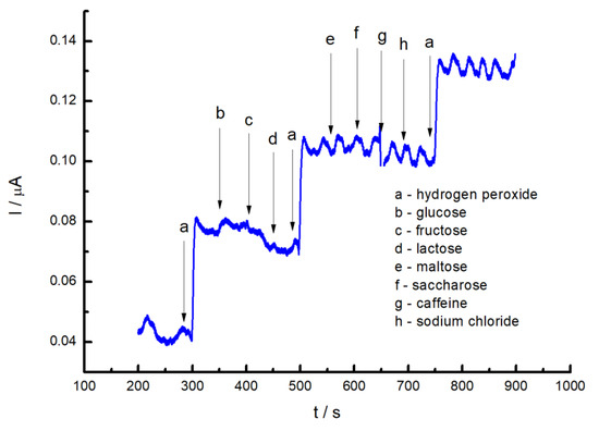 To assess the selectivity of the GC/MWCNTs/Pz3 electrode, the amperometric response was monitored in the presence of different interferents that can commonly occur in a variety of bodily fluids (in this work: glucose, fructose, lactose, maltose, saccharose, caffeine, and sodium chloride) at +0.6 V with stirring (Figure 7). While H2O2 addition gave a fast current response, none of the inserted interferents resulted in a current reply. Therefore, the obtained sensor has a satisfactory selectivity. In addition, analogous tests were carried out for the modified electrodes: GC/SWCNTs/Pz3 and GC/rGO/Pz3. The results of these analyses are shown in Figure S5. As in the case of the GC/MWCNTs/Pz3 electrode, no interference effect was observed. A decrease in the current signal was observed over time.