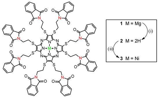 Phthalimide-substituted magnesium(II) Pz (1) and its metal-free derivative (2) were prepared using a previously reported three-step synthetic pathway [27]. Next, by modifying a procedure from the literature [28], a Ni2+ cation was introduced into the Pz2 macrocyclic core by heating Pz2 and nickel(II) acetate tetrahydrate in DMF, which led to the formation of nickel(II) symmetrical porphyrazine Pz3 (Scheme 1). The compounds obtained were isolated chromatographically and their properties evaluated by spectral methods—mass spectrometry and UV–VIS spectroscopy. NMR experiments were performed to confirm the structure of Pz3. The 1H and 13C NMR resonances were unambiguously assigned using a combination of one-dimensional (1H, 13C) and two-dimensional (1H–13C HSQC, 1H–13C HMBC and 1H–1H COSY) experiments. A detailed analysis of the NMR spectra can be found in Figures S1–S3 and Table S1. The signals at 4.34 ppm were assigned to the SCH2 groups based on their correlation with the C2 and C3 pyrrole carbons at 140.5 ppm in the 1H–13C HMBC spectrum. The correlations between carbonyl carbon signals at 167.8 ppm and hydrogen atom signals at 4.19 ppm and 7.27 ppm allowed to assign the NCH2 hydrogen atoms of the ethylsulfanyl linker and phthalimide protons, respectively. The identification of aromatic proton resonances of the phthalimide moieties, as well as protons of the ethylene groups, was supported by the two-dimensional experiments (Table S1). Furthermore, HPLC assessment of Pz3, performed in three different eluent systems, confirmed the purity of the new macrocycle as exceeding 98%, with detection simultaneously at 380 nm and 670 nm (see Supplementary Materials).