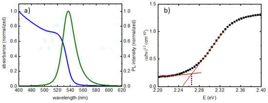 (a) Normalized absorbance and PL from the PQD film on glass; (b) determination of band gap from absorbance, corrected for tail states according to Ref. [14].