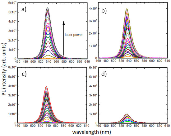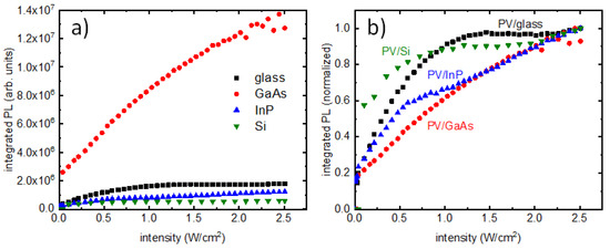 Steady-state PL spectra were measured from the PQD films as a function of laser powers between 0 and 315 mW, with 5 mW intervals for all samples, except for the PV/Si sample, where the interval was 10 mW. All the PL measurements and corresponding growth of PL intensities with laser intensity are presented in Figure 3 and Figure 4, respectively. It is clear from Figure 3b that the PV/GaAs sample has PL intensity one order of magnitude higher than the rest of the samples and so normalization versions were needed for comparison. Figure 4a presents a comparison of PL intensity growth in all samples, with Figure 4b showing a comparison of their normalized versions. The different step sizes used in PV/Si measurements did not contribute to the trend, as is evident in Figure 4a. The minimum laser power for which an emission was detected for the PV/glass sample was 3.5 mW (Figure 3a), corresponding to an intensity of ~0.0278 W/cm2. The minimum excitation intensities for PL in PV/GaAs, PV/InP and PV/Si samples could be found from the respective plots as ~0.0278 W/cm2, ~0.0040 W/cm2 and ~0.1035 W/cm2. The thresholds of PL saturation for PV/glass, PV/GaAs, PV/InP and PV/Si samples could be found from Figure 4b to be at ~1.0 W/cm2, ~2.0 W/cm2, ~0.7 W/cm2 and ~0.5 W/cm2, respectively. These results confirm a universal saturation of emission in PQDs, where the thresholds of saturation are dependent on the substrates on which the films were deposited. In addition, there are differences in the way integrated PL evolved as laser intensity increased.