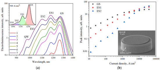 At the highest injection currents, still another excited-state optical transition (ES3) manifests itself as a weakly pronounced change in the slope of the spectral curve near 1025 nm. In addition, the emission band, which is attributed to the radiative electron-hole recombination in the covering InGaAs quantum well, is observed close to the wavelength of 985 nm. The intensities of the optical transition peaks are presented in Figure 1b as a function of the injection current. One can see that at, low injection currents, the ground-state luminescence band dominates in the emission spectrum. The current increase leads to the almost consistent emergence of the emission bands associated with the excited-state optical transitions. Starting from approximately 1 kA/cm2 injection current density, the saturation of the GS emission band intensity becomes apparent, which can be explained by nearly full occupation of the ground-state level with charge carriers. Further, the intensity of the emission bands associated with several excited-state optical transitions continue growing almost linearly with the current density, because of incomplete population of those excited-states levels having higher degeneracy factors compared to the ground-state one. Starting from 5 kA/cm2, the intensity of the ES1 band exceeds that of the GS band. At 20 kA/cm2, the ES2 emission peak becomes dominant. The observed evolution of the spontaneous emission of quantum dots with the pumping power was also observed by other research groups [31,32].
