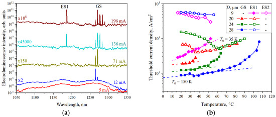 There is also a temperature-induced growth of the carrier concentration in the waveguiding layer. This should lead to an increase in optical loss by free carrier absorption [33,34] and, therefore, to a more rapid rise of the threshold current density. It can be seen that the temperature, which corresponds to the beginning of a faster (super-exponential) increase in the threshold current, shifts towards lower values as the microdisk diameter decreases. For example, T0 of 150 K satisfactorily describes the temperature behavior of up to approximately 60 °C for the 28 μm microdisk, while it is only 30 °C for the 20 μm microdisk. Since the threshold current density of GS lasing increases and the threshold current density of two-state lasing decreases with increasing temperature, the current density interval of pure GS lasing becomes narrower. Above a certain critical temperature, , GS lasing disappears. In the microdisk laser with a diameter of 28 μm, the critical temperature is 107 °C. It is worth mentioning that, in the edge-emitting laser with the stripe length of 1 mm, GS lasing disappears at the same temperature of 107 °C. As shown in Figure 3a, the critical temperature is found to be dependent on the microdisk diameter (i.e., on the optical loss) and decreases to 37 °C and 64 °C for the diameters of 20 and 24 μm, respectively.