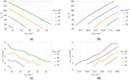 Since the total loss is the sum of internal and output losses, we see that the critical temperature is lower for higher output loss, i.e., for smaller microdisks. Figure 5a,b show the critical temperature and the respective threshold current density (that is, coordinates of the intersection point of the curves in Figure 4) as a function of output loss for various values of and as a function of for various output losses, respectively. It is clear that temperature dependence is almost linear for a wide range of both variables, whereas threshold current dependences, presented in Figure 5c,d, exhibit some irregularities. Nevertheless, both dependences can be subjected to linear fitting, which yields: