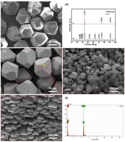 SEM observation and XRD analysis: SEM image of (a) raw diamond and (c) Ti-coated diamond particles as well as (d,e) (100)—oriented and (111)—oriented diamond plate, as well as (b) XRD patterns of raw diamond particles and Ti-coated diamond particles, as well as (f) EDS element line of (c).