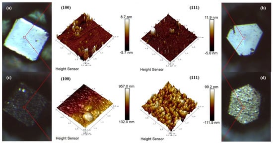 As shown in Figure 3, AFM 3D images of raw diamond particles and Ti-coated diamond particles are examined to research their surface characteristics further. For the former, as seen in Figure 3a,b, the surfaces on the raw diamond-{100} and -{111} facets are relatively smooth and flat. For the latter, as illustrated in Figure 3c,d, the titanium grain sizes on the diamond-{100} facet are more extensive than those on the diamond-{111} facet, but they are both in nanoscale. Additionally, the result is similar to the SEM images shown in Figure 2c–e. Obviously, the existence of pits and protruding interfaces is conducive to the stable combination between the diamond surface and the matrix copper in the subsequent liquid-solid separation process [35]. In addition, the root mean square (RMS) surface roughness of the Ti-coated diamond-{100} facet is measured to be ~29 nm, higher than that of the diamond-{111} facet (Ra = 23.9 nm) by AFM. The anisotropy of the titanium deposition on the diamond surface might be explained by the gas desorption temperature and the surface energy of different facets [36,37]. A larger surface roughness means a more prominent disordered region between the peaks and valleys on the titanium coating surface, since the electron transport at the metal interfaces will be controlled by disordered elastic scattering [38,39]. Therefore, a reasonable thickness of the interfacial coating is essential to the thermal conductivity of composites.