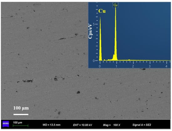 Figure 4 shows the microstructure of the separated liquid phase and the EDS element mapping in the corresponding region, which proves that the field of view is pure copper and no single-crystal diamond particles exist in the separated liquid phase. It means that the 2 mm channel can retain the diamond particles in the LSS chamber. Therefore, the diamond/Cu composites with different volume fractions are precisely fabricated by changing the volume of the LSS chamber. In general, there are some pores among the diamond particles and the copper powder during cold pressing [40]. However, the pores eventually dissolved as the LSS process completed, which is essential for the high relative density of diamond/Cu composites.