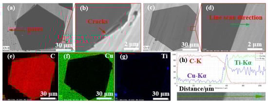 Figure 5 shows 40 vol.% Cu/diamond composites by LSS technology with uncoated diamond particles and Ti-coated diamond particles. It can be observed from Figure 5a,b that there are obvious cracks and pores between the uncoated diamond particle and the Cu matrix. Moreover, these defects are equivalent to air, while the thermal conductivity of air is only 0.026 W m−1 K−1 [41], which obviously reduces the thermal conductivity of diamond/Cu composites. Moreover, the chemical incompatibility and the different thermal expansion coefficients between the diamond particles and copper matrix are also revealed. Figure 5d shows that the diamond particles are closely bonded to the Cu matrix for the Ti-coated diamond/Cu composites. The EDS results obtained along arrowheads in Figure 5c are depicted in Figure 5h. It is clear that the titanium element is distributed at the interface between diamond and copper, and the elements carbon, copper, and titanium have some mutual diffusion at the interface. The XRD patterns of Ti-coated diamond/Cu composites and the XPS spectrum of diamond particles extracted from them in the subsequent content demonstrate that carbon atoms from the diamond and titanium atoms from the coating layer have reacted to form titanium carbide (TiC) during the LSS process. The possible factors for enhancing interfacial bonding are as follows. On the one hand, the formation of titanium carbide can improve the bonding of the interface between the diamond particles and copper matrix.
