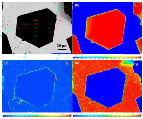 Figure 6 presents the element distribution maps on the polished surface of the Ti-coated diamond/Cu composite. The SEM image in the backscattered electron (BSE) mode (Figure 6a) shows a whole diamond particle embedded in the copper matrix used for EMPA characterization. From the inside of the diamond to the boundary of the diamond, has gradually changed from carbon to titanium. It can be seen that titanium enriches along the interface between the diamond and copper matrix and a rare part distributes in the matrix. It is consistent with the results of EDS in Figure 5e–h, which indicates that the transition layer at the interface of the Ti-coated diamond/Cu composite are mainly titanium-containing phases. The results of XRD and XPS confirm that the bonding phases on the interface between the diamond particles and copper matrix are identified as titanium carbide (TiC). Interestingly, the high content in a few positions may be related to the enrichment of titanium on the surface of diamond particles during the vacuum ion plating process. Moreover, it can be assumed that titanium carbide nucleation occurs preferentially at the diamond facets’ surface defects, where carbon may be more easily liberated to form carbide.