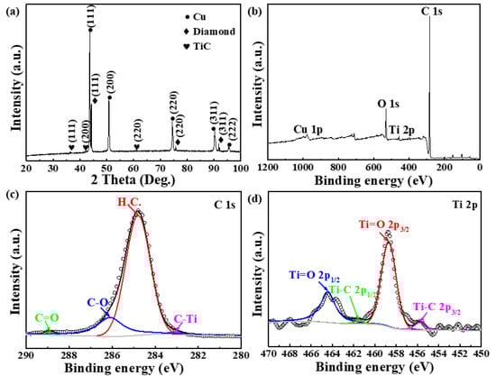To further analyze the chemical composition of the interfacial layer’s surface between the diamond and copper, XPS analysis of the diamond particles extracted from the Ti-coated diamond/Cu composites was conducted, as shown in Figure 7b–d. The XPS analysis reveals the chemical composition containing C, O, Ti, and Cu, as shown in Figure 7b. High-resolution XPS spectra at C 1s in Figure 7c shows that there are four apparent peaks in the C 1s region, and they are attributed to 283.1 eV (C-Ti), 288.9 eV (C=O), 286.1 eV (C-O), and 284.8 eV (H.C.), respectively. Figure 7b displays the Ti 2p XPS spectra and the Ti 2p3/2 has been split into two peaks. The weak peaks at 455.8 eV and 461.52 eV are ascribed to the Ti 2p1/2 and Ti 2p3/2 in TiC. Above these indicate the formation of TiC due to the reaction between diamond and titanium, which conforms with the XRD results. In addition, the oxygenated carbon functional groups are likely from the oxygen in the atmosphere during the LSS process.