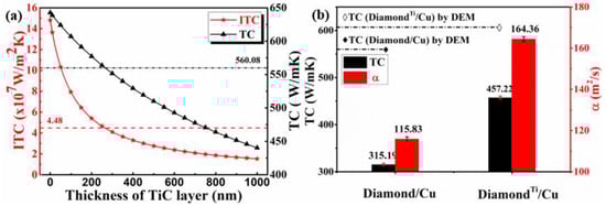 (a) ITC and TC of 40 vol.% DiamondTi/Cu composites with TiC layers with different thickness, and (b) The TC and α of 40 vol.% Diamond/Cu and DiamondTi/Cu composites with the ~100nm TiC layer.